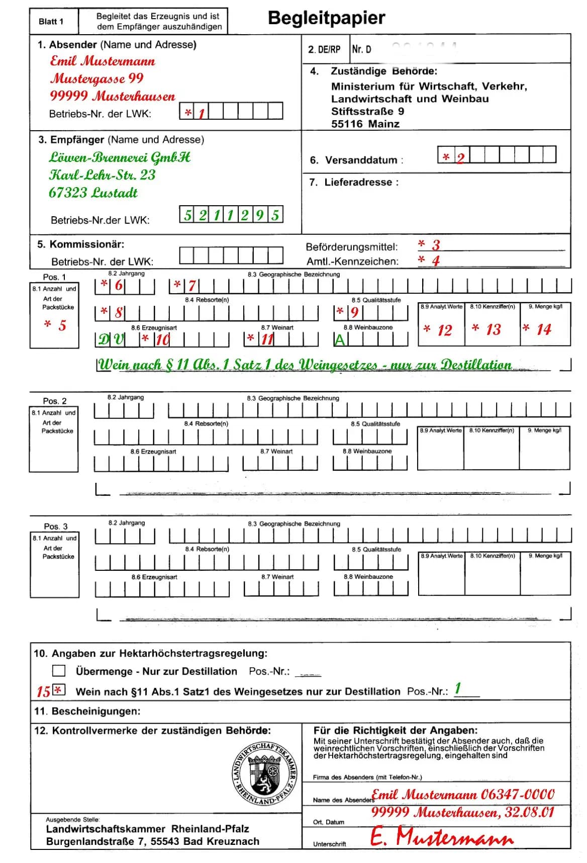 Die grün ausgefüllten Felder sind bei der Destillation der Übermenge immer gleich. Wichtig hierbei ist der Satz „Wein nach § 11 Abs. 1 Satz 1 des Weingesetzes – nur zur Destillation“. Dieser Satz muss handschriftlich ergänzt werden, wenn er nicht im Feld 10 (hier *15) angekreuzt werden kann.